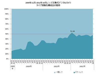 2009年11月-10月 レンズ交換式カメラ タイプ別販売構成比の推移 出展:「BCNランキング」2009年~2012年10月<最大パネル> 拡大画像表示