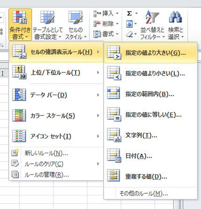 2)リボンから「条件付き書式」をクリックし、「セルの強調表示ルール」を選択。さらに「規定の値より大きい」を選択します。