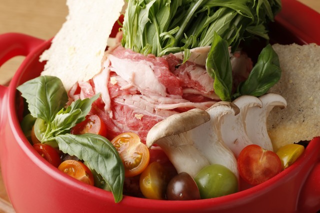 「ホットワインのプレゼントつきサンタモニカ・ミート・トマト鍋」は、春野菜とたっぷりの肉を豪快にポットに投入。鶏がらベースの旨味たっぷりのダシで、肉を煮込むとこで旨さが倍増されています。シャキシャキ感を少し残した野菜を柔らかい肉と一緒に食べる食感が癖になります。さらに、ほんのり感じるジンジャーとガーリックがさっぱりとしたアクセントとなり、食欲をそそり体を芯から温めます。トマトやバジルソースに鍋の具をディップして食べるのも楽しいです。