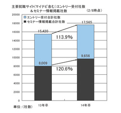2月上旬までに各就職サイトでエントリーを受け付けている企業の社数合計が対前年で113.9%、セミナー情報掲載は120.6%といずれも増加。セミナーを早期開始する傾向が高まっている。 出所:マイナビデータ('13年2月上旬)拡大画像表示