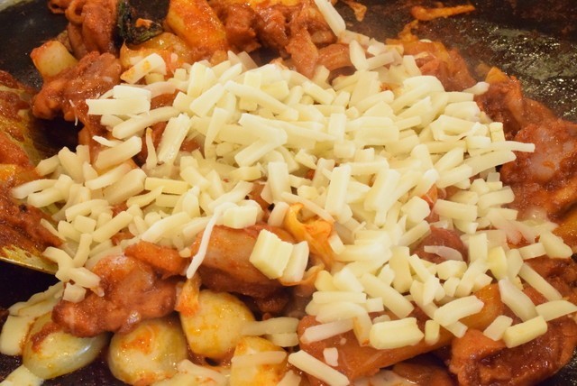 3000ウォンのチーズをトッピングすれば、話題のチーズタッカルビに。『ミストー・タッカルビ』