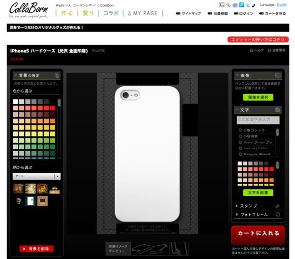 もとはTシャツなどのオリジナルデザインを専門とする「CollaBorn」でも、オリジナルスマホケースを個人注文の1個~団体注文で展開しています。CollaBornのWebサイトから、iPhone4、iPhone5、GALAXYなどから、スマホの機種を選んで、デザイン作成画面に移動します。ケースにしたい写真をアップロードし、色やテキスト、スタンプなどをレイアウトすると完成。価格は2980円~。