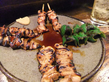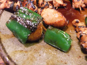 「次はタレで鳥、ピーマン、つくね、シロ、テッポウね」