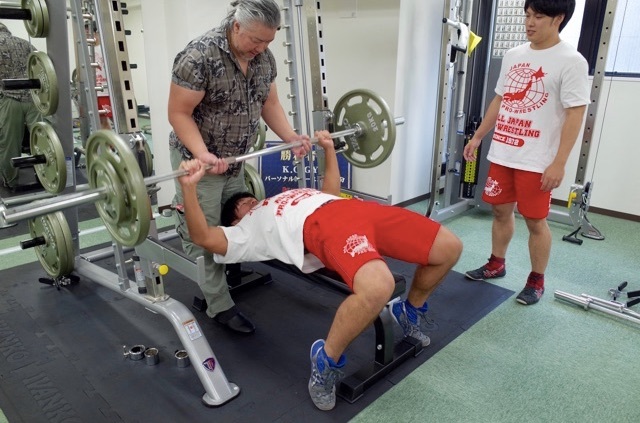 最初は大胸筋を鍛えるベンチプレス。プロレスラーの皆さんは、60kg超のバーベルを持ち上げるところからスタート。それを筋肉の収縮を素早く繰り返すよう、スピード全開で30回上げていきます(以下、筆者は重量を下げて20回、という特別メニューを与えてもらいました)。