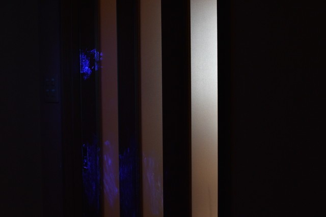 明かりを消してブラックライトを照射すると、手で触れた部分がぼんやりと青白い光を放ち、感染の様子が明らかに…!