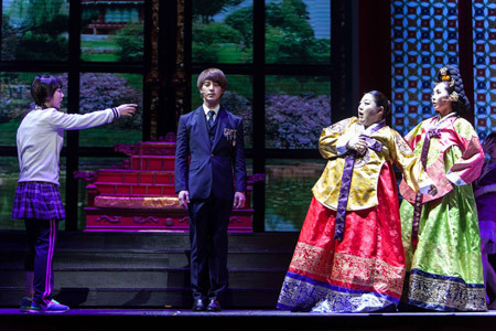 初日にシン役を務めたのは、3年連続で同役を射止めたソンモ(超新星)。憂いを含んだ黒目勝ちな瞳と、余韻に満ちた甘い歌声が印象的で、チェギョンへの不器用な愛を深く繊細に演じた。とりわけ皇太子としての孤独を歌うソロ曲『I want freedom』の切ない響きが耳に残る。もちろん、K-POPアイドルのお家芸ともいえる歌とダンスでも魅了してくれる。多彩な衣裳替えもファンにとっては見どころだ。同じく3年連続でユル役を務めるチャン・ユジュンは、優しげな顔立ちと佇まいが役にぴったり。シンとの対決の後、珍しく感情を爆発させるチェギョンとのナンバー『叶わぬ恋』は、情感たっぷりのウィスパーボイスと相まって、タイトルに見て取れる恋の顛末が哀しい。また、制服の下にジャージを着込んだ“今どき女子高生”のヒロインを演じたクァク・ソンヨンは、透明感のある高音を駆使した伸びやかな歌声と、ハツラツとした演技で、本作のコメディ要素を担うような弾けっぷりが好印象。伝統衣裳を身にまとったプリンセス姿との、良い意味でのギャップも見ものだ。