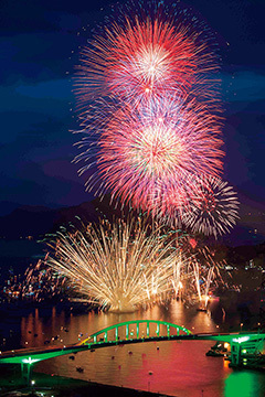 ★【水中】水中花火を実施 ★【海】海辺で行われる ★【音楽】音楽と連動した花火が打ち上がる ★【万発】1万発以上打ち上がる ★【滝火】仕掛け花火(ナイアガラ)実施 ★【競技】花火コンクール(競技会)実施 ★【川湖】川畔や湖畔で行われる