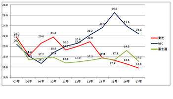 全国の主要家電量販店・ネットショップの実売データを集計した「BCNランキング」のノートPCの年間販売台数シェアの推移(1月~12月)をみると、東芝は2007年にNECを抜いて21.7%で首位に立ち、10年まで5年連続で首位をキープしたが、11年からは再びNECに巻き返されて、15年には富士通にも抜かれて3位に後退している。(BCN・細田 立圭志)