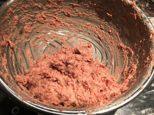 冷やした牛肉をミンチにし、素早く手でこねる(冷やす理由は後述)。それにより肉汁を閉じめることができるのだそうだ。
