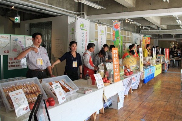 今回の物産展はメンバーの歌広場淳さん(Be-su)がプロデュースする「食べて応援しよう! 秋の実りで復興支援 フルーツ物産展」というもの。農林水産省の後援も得ているという本格的な東北復興イベントです。天候にも恵まれ、朝からお客さんも沢山集まっていました。