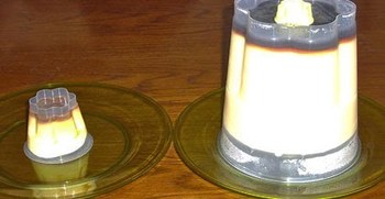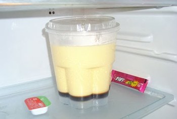 容器にどちらも注ぎます。プリンの部分を先に注いでからカラメルを中央に注ぐと、きれいにカラメルだけ下に沈んでカラメル層を作るのが面白い!実際売られているプッチンプリンも凍らせて割って見てみるとプリンの中央に、後からカラメルを注いだあとが見えることもあるそうです!
