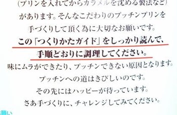 つくりかたガイドには「プッチンへの道はきびしいのです」との警句が。他にも随所に「しっかり」「ちゃんと」など繰り返されていて、作るのが難しいんじゃないかと緊張します。失敗したらどうしよう。