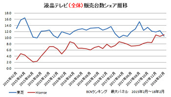 東芝がテレビ事業を手がける完全子会社・東芝映像ソリューション(TVS)の株式の95%を、中国ハイセンスグループに譲渡すると発表したのは、2017年11月14日。これまで具体的な事業計画について触れられてこなかったが、3月16日の日本経済新聞が「3年以内に黒字化を目指す」という中国ハイセンスの周厚健董事長の言葉を報じた。ここ数年、国内のテレビ市場で認知を広げているハイセンスは、これまでの競合であるREGZAに何を期待するのか。実売データの推移から戦略を分析した。 家電量販店・ネットショップの実売データを集計する「BCNランキング」から抽出した直近3年の液晶テレビ全体の販売台数シェアによると、東芝が10%台で浮き沈みしているのに対して、ハイセンスはじわじわとシェアを上げ、17年12月に初めて10%を突破。2月にはついに東芝を上回った。