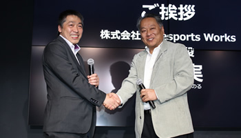 発表会であいさつするE5 esportsWorksの長縄実代表取締役(左)とサードウェーブの榎本一郎常務取締役