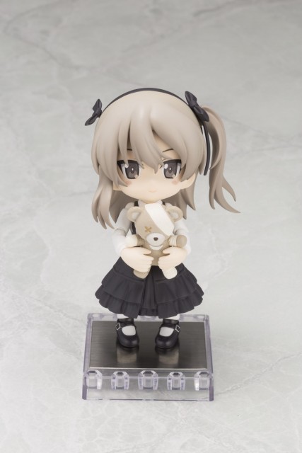 発売される「キューポッシュ 島田愛里寿」は、黒と白を基調にしたゴシックなデザインの私服姿となっており、彼女が愛してやまない「ボコ」のぬいぐるみも一緒に立体化。クールな無表情顔、可愛らしい笑顔の表情パーツに加え、ぬいぐるみボコを抱っこできる抱え手などの交換パーツも用意されています。