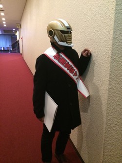 イベントの様子をじっと裏から見守る仮面宣伝マン拡大画像表示