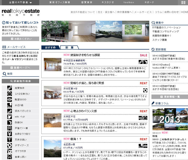 通常のお部屋探しのサイトであれば、場所や通勤時間から絞って行き、さらに価格や新着情報で並べ替えをして、条件に合うものを探していくと思うのですが、R不動産のカテゴリーは、「レトロな味わい」「水辺/緑」「お得な訳あり」などのカテゴリーになっており、価格や駅からの距離で物件を選ぶわけでなく、一覧の画像や詩的なタイトルの中から気に入ったものをクリックし、さらに、個性的な物件を多々見てきているスタッフの方の紹介を読み、住むところを決めるといった感じの探し方のさきがけかもしれません。