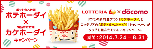 NTTドコモは、通話時間や回数の制限なしで国内通話を利用できる新料金プラン「カケホーダイ」と、ロッテリアとのコラボレーションキャンペーン「ポテホーダイ×カケホーダイ キャンペーン」を実施する。期間は、7月24日から8月31日まで。