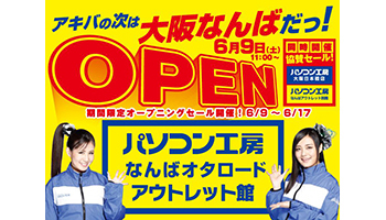 パソコン工房を運営するユニットコムは、PCやPCパーツ、スマートフォンの良品アウトレットを専門に取り扱う「パソコン工房 なんばオタロード アウトレット館」を6月9日にオープンする。4月28日に東京・秋葉原でオープンした「パソコン工房 秋葉原アウトレット館」の第2弾となる。