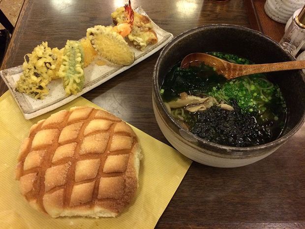 さっそく店内に入り「大えび天ぷらそば」(1,000円)と「ジャンボめろんぱん」(200円)をオーダーする。