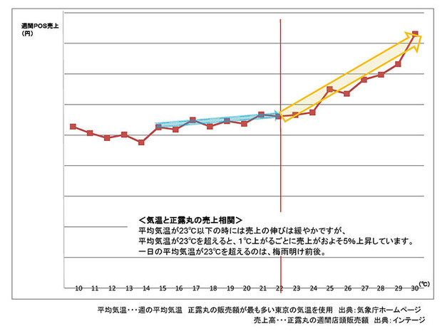 実はおなかの調子を整える止瀉薬「正露丸」の売上は夏がピーク。一日の平均気温が23℃になると、気温が一度上がる毎に、売上は5%上昇するのだとか。