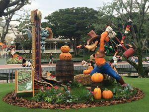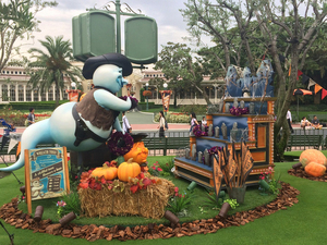 プラザには「ハロウィーン・フェア」のお祭りで遊ぶミッキーたちのフォトロケーションが登場。