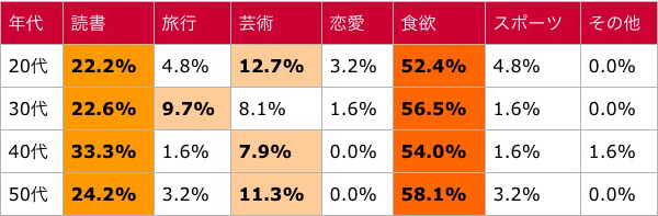 もっとも多かったのは「食欲」の秋! 定番ですよね。でも男女・年代別に見てみると興味深いことに気づきます。20代男性が他と比べて、「読書」と答える割合が高かったのです。その数38.7%と、およそ3人に1人の割合。今どきの20代男性は読書欲が強いようです。