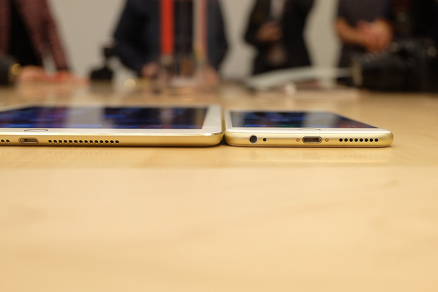新しく登場した9.7インチディスプレイのiPad Air 2(右)と、7.9インチディスプレイのiPad mini 3(左)。 拡大画像表示