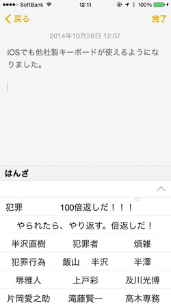 例えば、「はんざ」と入力してみます。そうすると「100倍返しだ!!!」「やられたら、やり返す。倍返しだ!」といった文章も変換候補に表示されます。