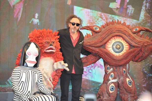 トレードマークの黒いジャケットともじゃもじゃヘアで現れたバートンは大の日本びいきとしても知られ、彼の大好きなダダやピグモン等の円谷怪獣たちの出迎えに大喜び。