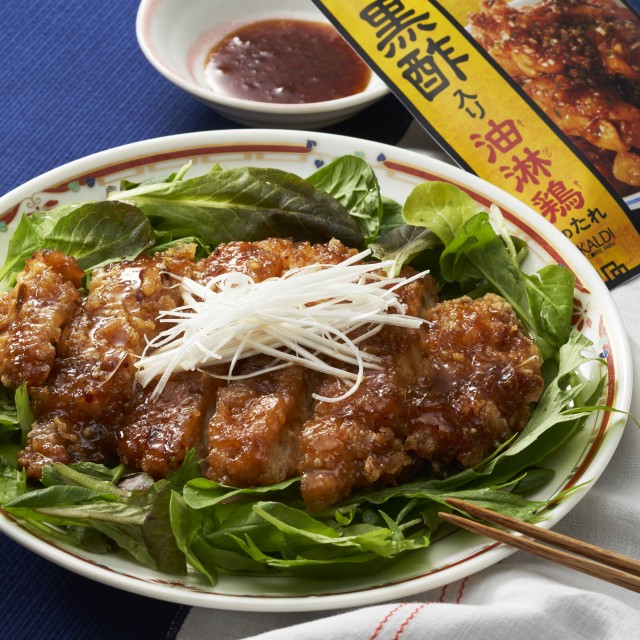 揚げた鶏肉にかけるだけで油林鶏が出来上がる「オリジナル 黒酢入り油淋鶏のたれ」は、ねぎと生姜の香りが豊かで甘酸っぱくコクのある味わい。