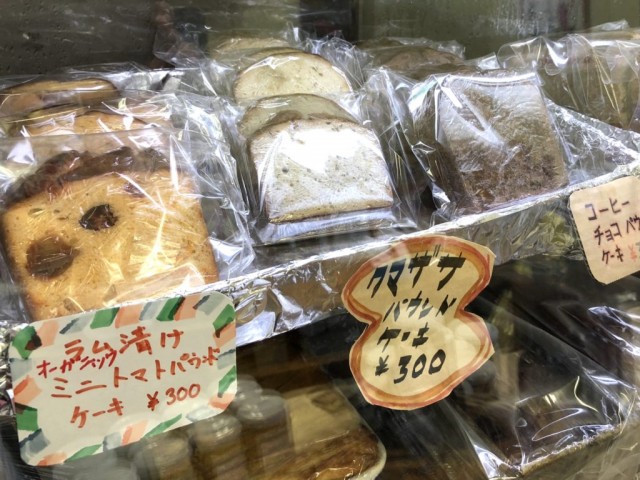 パウンドケーキもあって、オーガニックミニトマトのラム酒漬けやクマザサを使ったものなど、魅力的なラインナップ。