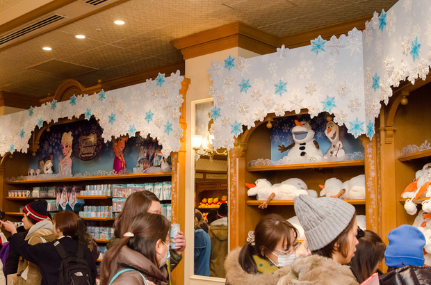 ワールドバザール内「グランドエンポーリアム」や「ワールドバザール・コンフェクショナリー」、「ディズニー・カンパニー」などでは、「アナとエルサのフローズンファンタジー」限定グッズコーナーが作られ、買い物をするゲストで賑わっています。
