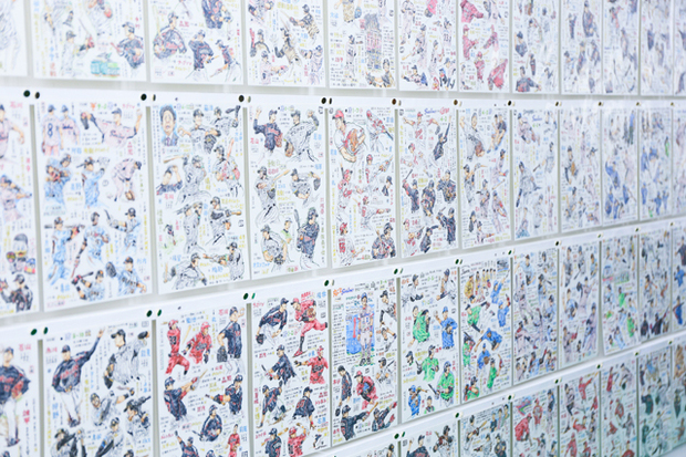 「最下位だったヤクルトの2年間に、ひとりの男がどういうことをやってきたのか?っていうのをしっかり見てもらいたい」との思いで、個展会場には2013年と2014年シーズンの全試合のイラストを並べて展示。