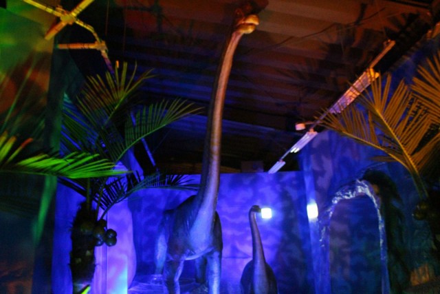 草食恐竜に気を取られていると、激しい肉食恐竜たちのゾーンに突入。暗闇に隠れているティラノザウルスの姿は、怖がってママの方に抱き着いてくるくらいリアル。