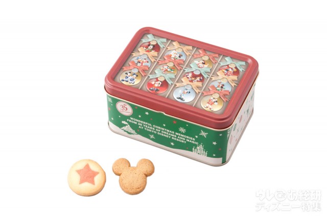 歴代のクリスマスイベントに登場したミッキーがデザインされた缶パッケージ入りのクッキー。