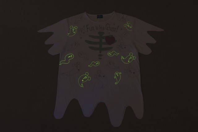 じつはこのTシャツは、暗いところでオバケが浮かび上がる楽しい仕掛けつき。