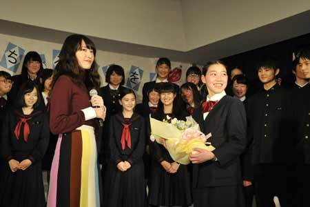 映画は、島の中学校を舞台に、若い女性教師と合唱部の生徒たちの交流のドラマを爽やかに描いた作品で、イベント会場に登場した国分寺市立第三中学校の合唱部は2014年のNHK全国学校音楽コンクールの東京大会で銀賞に輝いている。