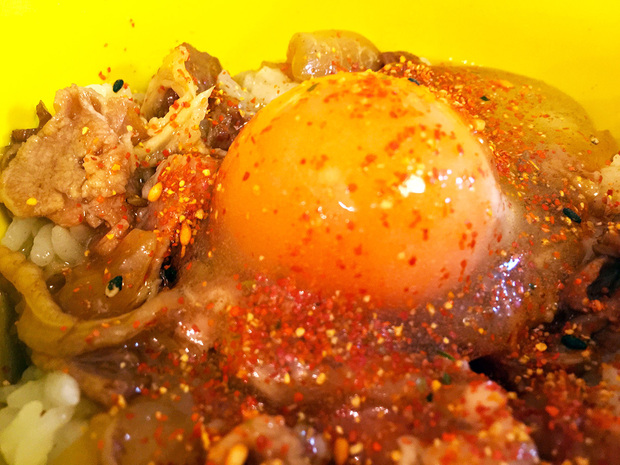 筆者は無類の七味愛好家なので、牛丼にたっぷりの七味をのせますが、黄身のトロトロ感と七味の相性もバツグンです。