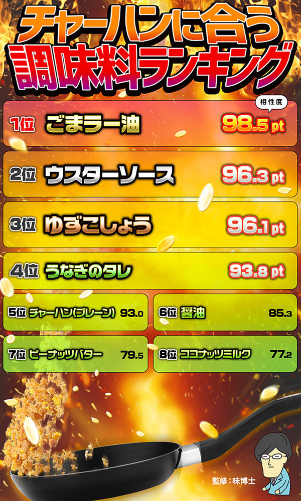 データによると、一見合いそうだった醤油の相性度はあまり振るわない結果に…。味博士によると、醤油のずば抜けた塩辛さが、もともと塩っ気のあるチャーハンとぶつかり合って合わないのだとか。