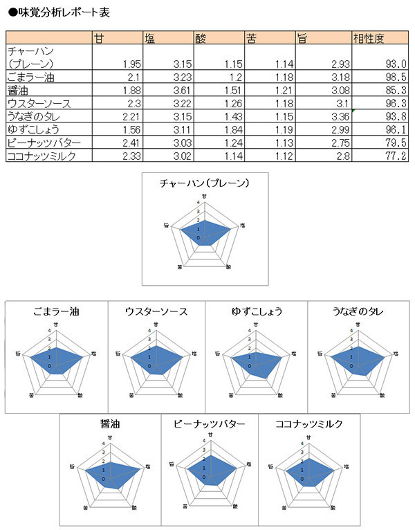 味覚センサー「レオ」で、各調味料をかけたチャーハンを解析して、チャーハンと調味料の相性度が算出されました!