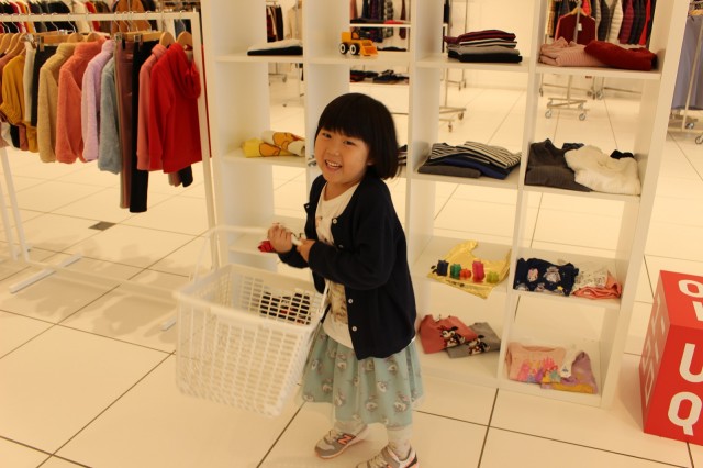 買い物かごに着てみたい服を入れてご満悦の表情の娘。みなさんも家族で買いに行くと、試着が面倒でいつも買う服と同じサイズや、テイストのものを選んでしまう傾向があるのでは?