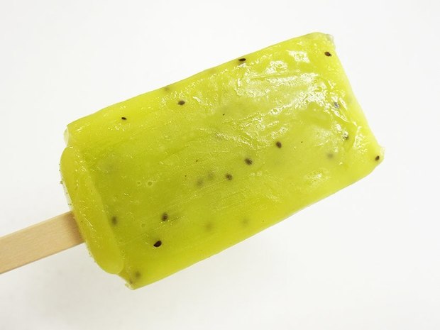 ニュージーランド産のグリーンキウイの果肉と果汁を使用しています。アイスキャンディ自体をフルーツに見立てていて、食感はねっちりした感じです。