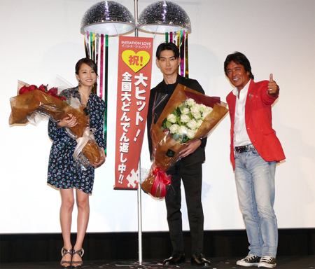 「映像化不可能」といわれたベストセラーを実写化した『イニシエーション・ラブ』の大ヒット御礼舞台あいさつが6月4日に、東京・TOHOシネマズ六本木ヒルズで行われ、主演の松田翔太と前田敦子が登壇した。公開12日間で、早くも観客動員は50万人を突破。ヒットを祝い、歌手の松崎しげるが駆けつけ、劇中に使用された代表曲「愛のメモリー」を熱唱した。