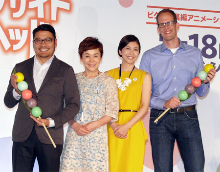 会見には日本語版キャストを務める“ヨロコビ”役の竹内結子、“カナシミ”役の大竹しのぶが駆けつけ、両監督に映画にちなんだ5色だんごをプレゼント。お互いの演技について「大竹さんの声とともに、カナシミのゆったりした動きやビジュアルが愛おしくなった」(竹内)、「すごくエネルギッシュな役柄で、結子ちゃんの喜びが直接伝わってきた。私自身もそばにヨロコビがいるから、安心してカナシミを表現できた」(大竹)と評した。