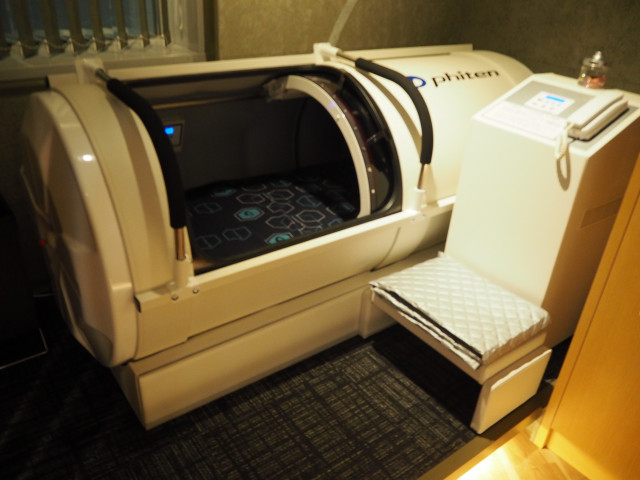 酸素カプセルは25分・55分の2コース。カプセル内に酸素を送り込んで気圧を高め、身体をリラックス状態にしてくれます。なお、酸素自体にも独自加工が施されているほか、下に敷かれたマットも高反発で耐圧分散してくれる独自のもの。アクアチタンも採用されているそうです。