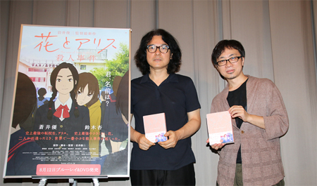 岩井俊二監督が手がけた長編アニメーション『花とアリス殺人事件』のブルーレイ&DVD化を記念して、8日に池袋の新文芸坐でオールナイトイベントが開催され、上映前に岩井監督と新海誠監督がトークショーを行った。