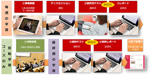 経営、マーケティングなど社会人のキャリアアップにつながる講座や、海外の受講生も視野に入れた日本文化に関する講座など多彩なラインアップで、これまでに著名な教授・講師による44講座を開講。一般的な大学の講義と同様に受講期間を設け、一定の修了条件を満たすと修了証を発行する。登録会員数は約14万人、一人あたりの平均受講数は約2.8講座、受講登録者数は延べ約39万人。一部の講座では、オンラインで学習した内容をもとに対面で発展的な講義を行う「対面学習コース」を有料で提供する。