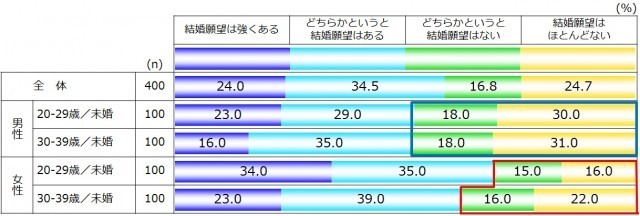 株式会社クロス・マーケティングが20~39歳の男女に「20代・30代の恋愛・結婚に関する調査」を行ったそう。すると、「結婚願望が強くある」「どちらかというと結婚願望がある」と答えた男女は58.5%。