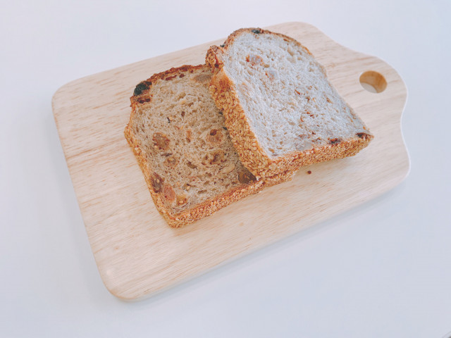 ライ麦を40%配合したパンに、オーツ麦・ひまわりなどの穀物と、レーズン・くるみが練り込まれています。